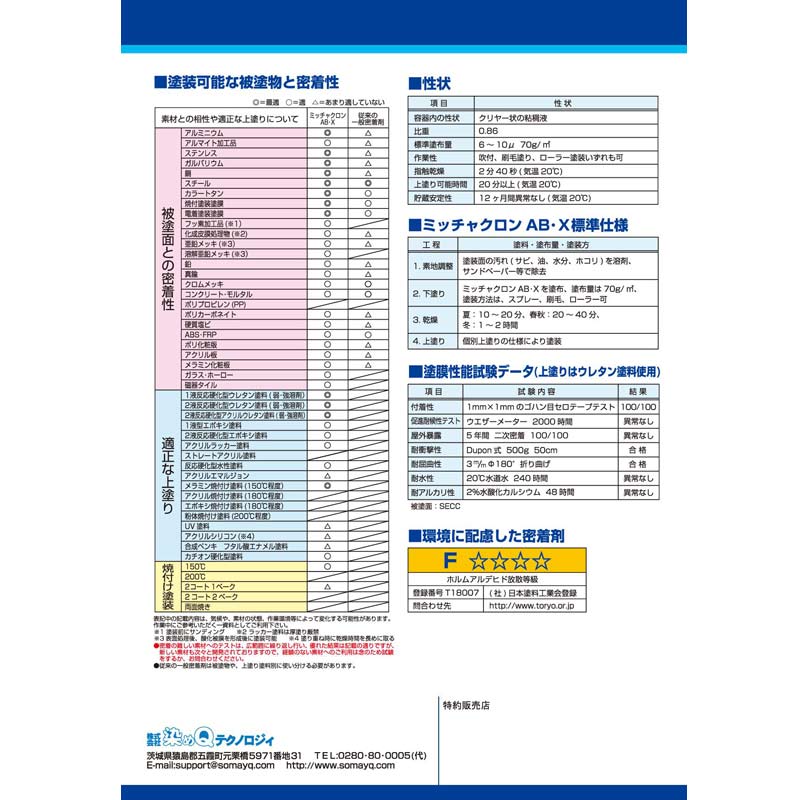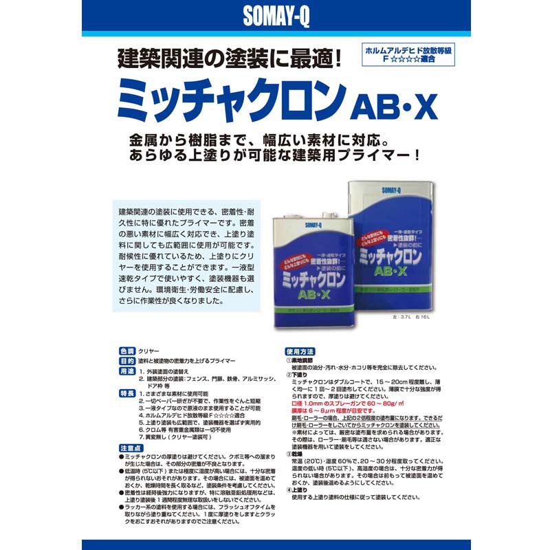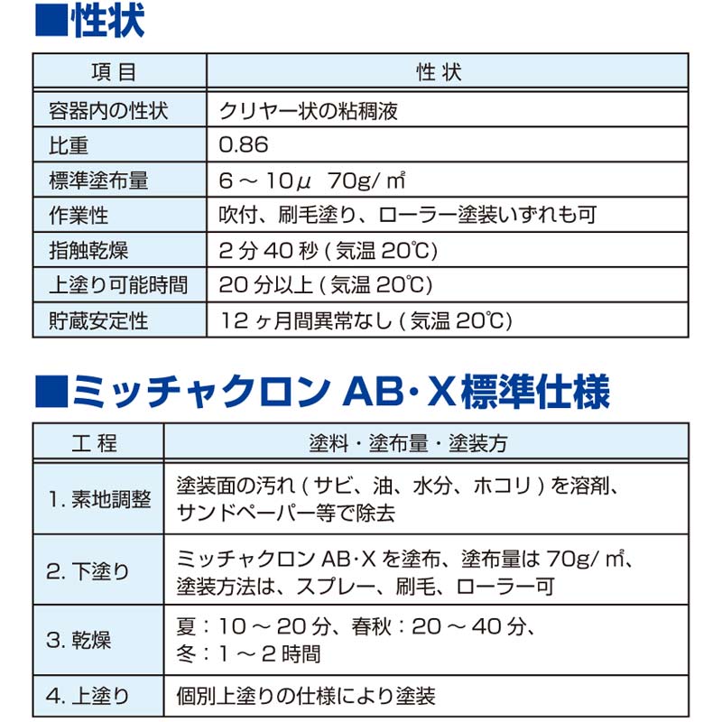 2.5℃以下の低温時また極度に湿気の高い場合はミッチャクロンAB・Xの特性が生じませんので被塗面を温めるか乾燥時間を長めにとるなど、塗装条件を変えるように考慮して下さい。