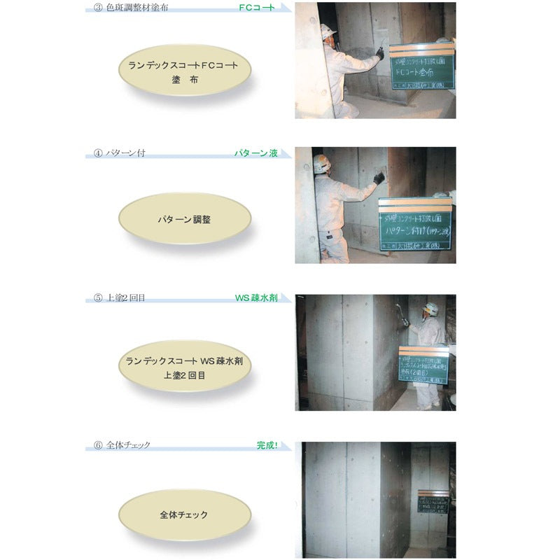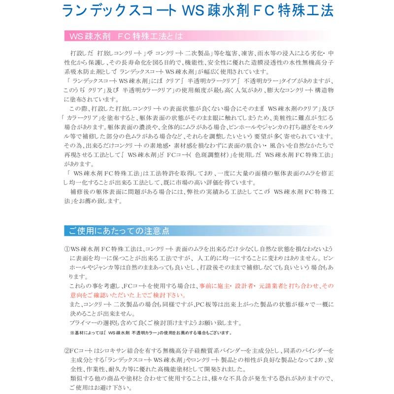 近年、コンクリート構造物の老化現象の防止や水を浸透しにくくして 中性化を防止する方法がさまざまに検討され、 いくつかの商品が生まれています。その中でも、 ランデックスコートWS疎水剤は、持続性があることを第一の目標と して開発した商品です。 2回の塗装工程で80〜100μmの膜圧が 得られ、コンクリート系の中性化防止に優れた効果を発揮し、 着色も可能です。コンクリートの打放し素地の良さを生かしながら 超疎水性にすることでコンクリートの風化を防止します。