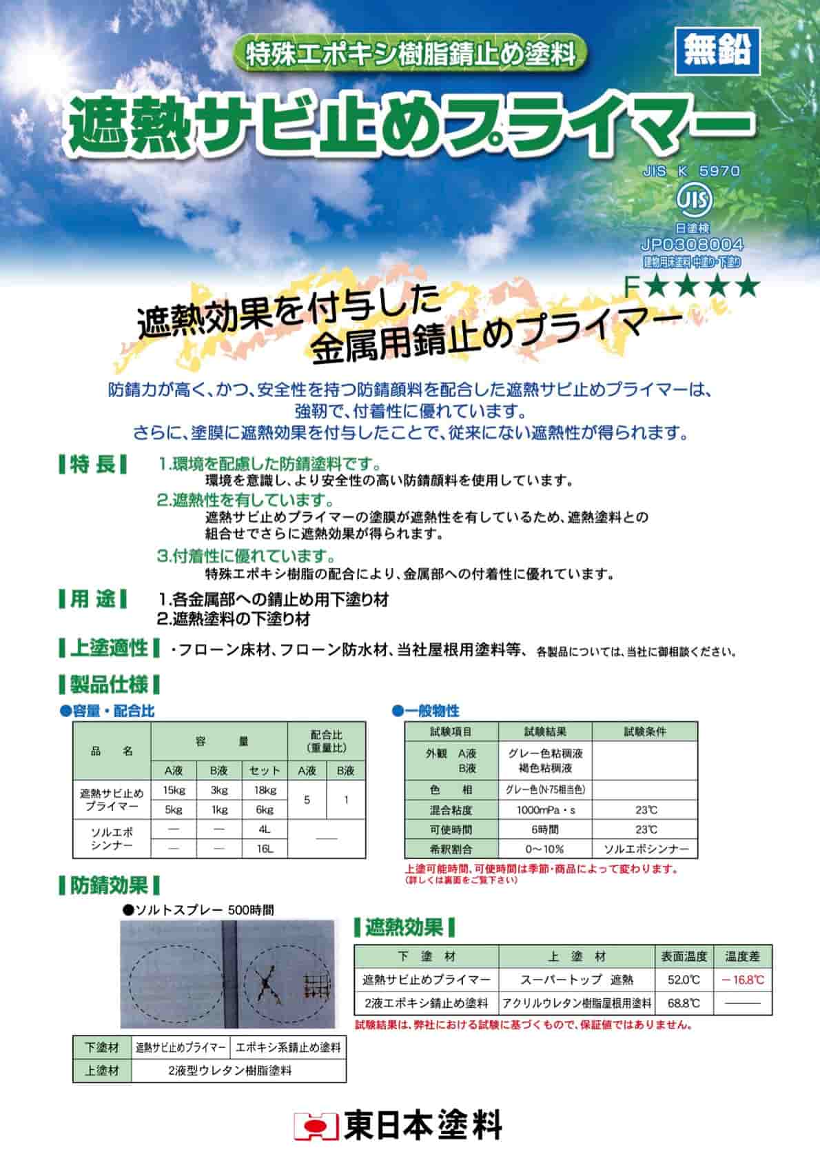 防錆力が高く、かつ、安全性を持つ防錆顔料を配合した遮熱サビ止めプライマーは、強靭で、付着性に優れています。さらに、塗膜に遮熱効果を付与したことで、従来にない遮熱性が得られます。