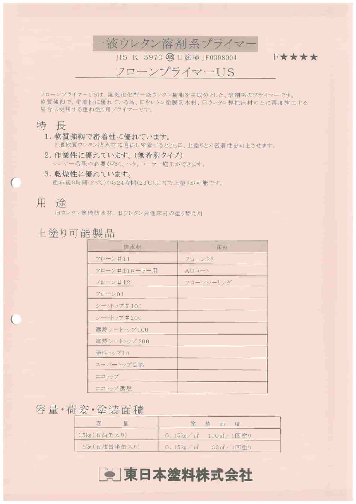 フローンプライマーUSは、湿気硬化型一液ウレタン樹脂を主成分とした、溶剤系のプライマーです。軟質強靭で、密着性に優れている為、旧ウレタン塗膜防水材、旧ウレタン弾性床材の上に再度施工する場合に使用する重ね塗り用プライマーです。