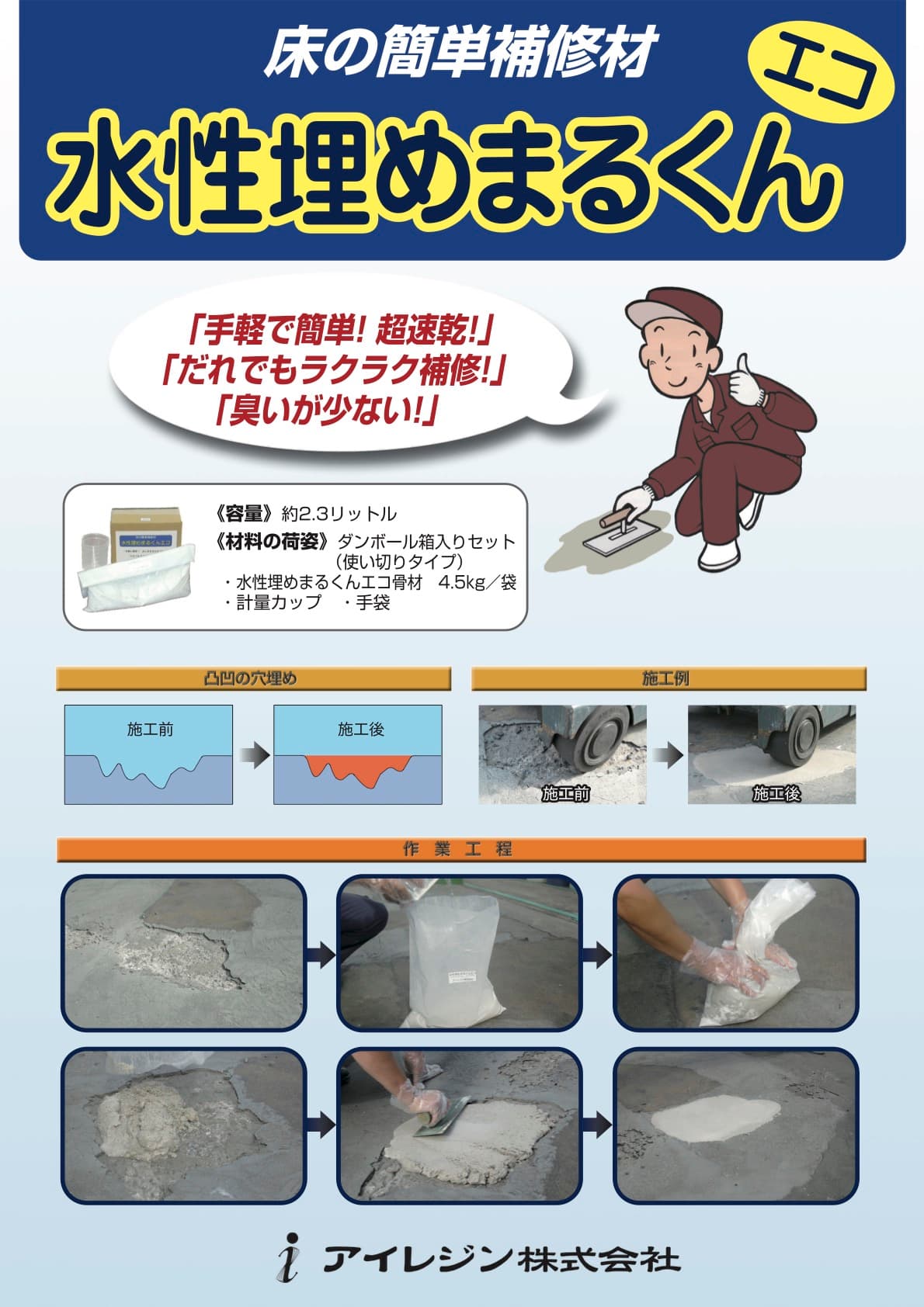 「水性埋めまるくん」は「埋めまるくん」の手軽さと低臭を合わせた床補修材です。 食品工場など臭いに敏感な場所に最適です。