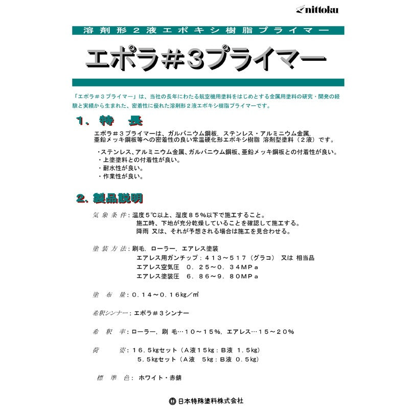 エポラ#3プライマーは、ガルバニウム鋼板、ステンレス・アルミニウム金属 亜鉛メッキ鋼板等への付着性が良い常温硬化形エポキシ樹脂 溶剤型塗料 (2液)です。