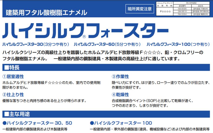 ハイシルクシリーズの高級仕上りを踏襲したホルムアルデヒド放散等級F☆☆☆☆のフタル酸樹脂エナメル