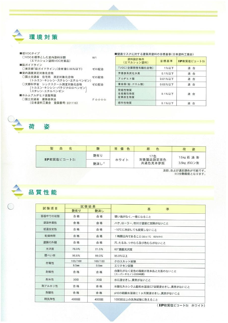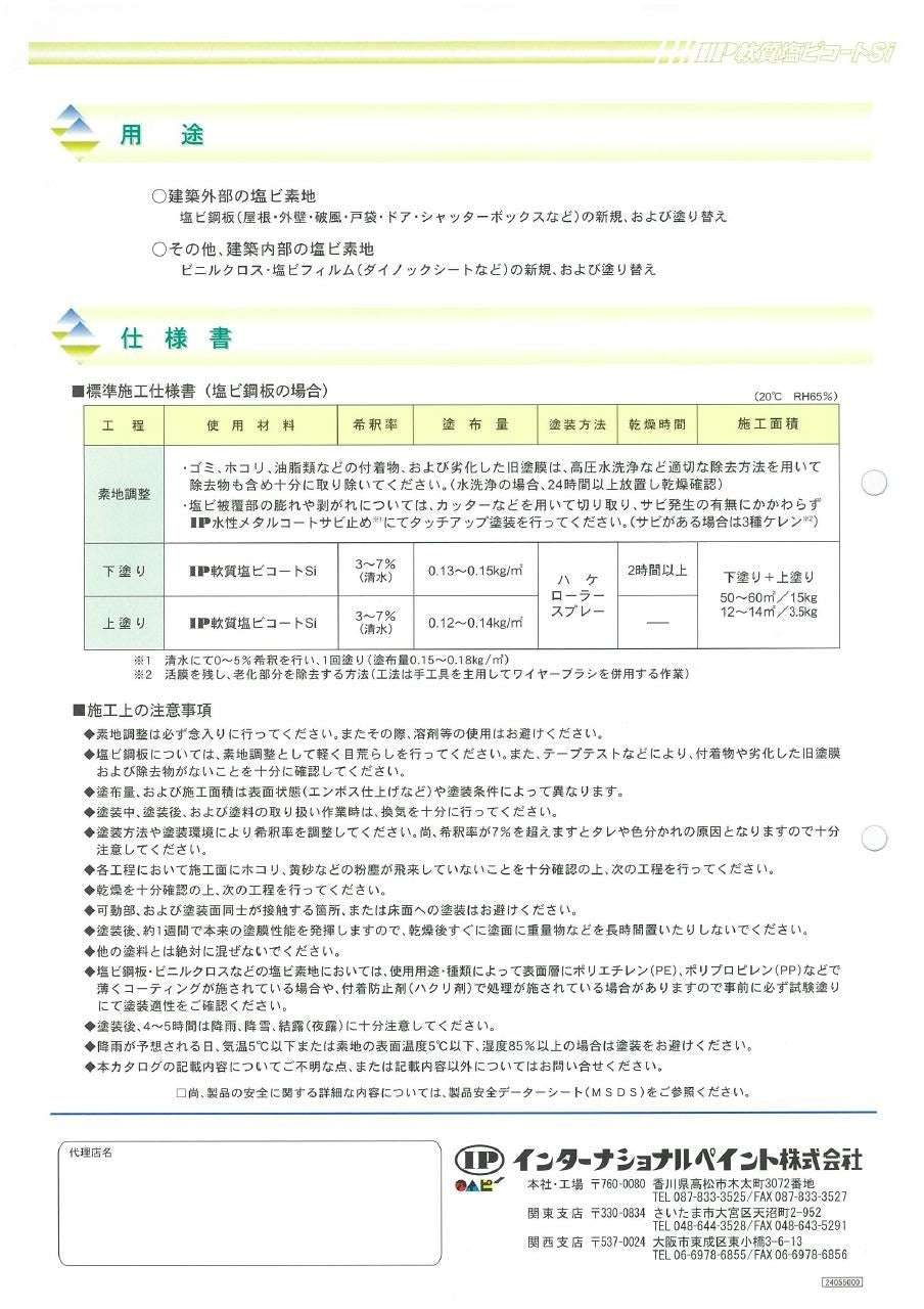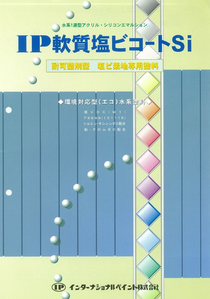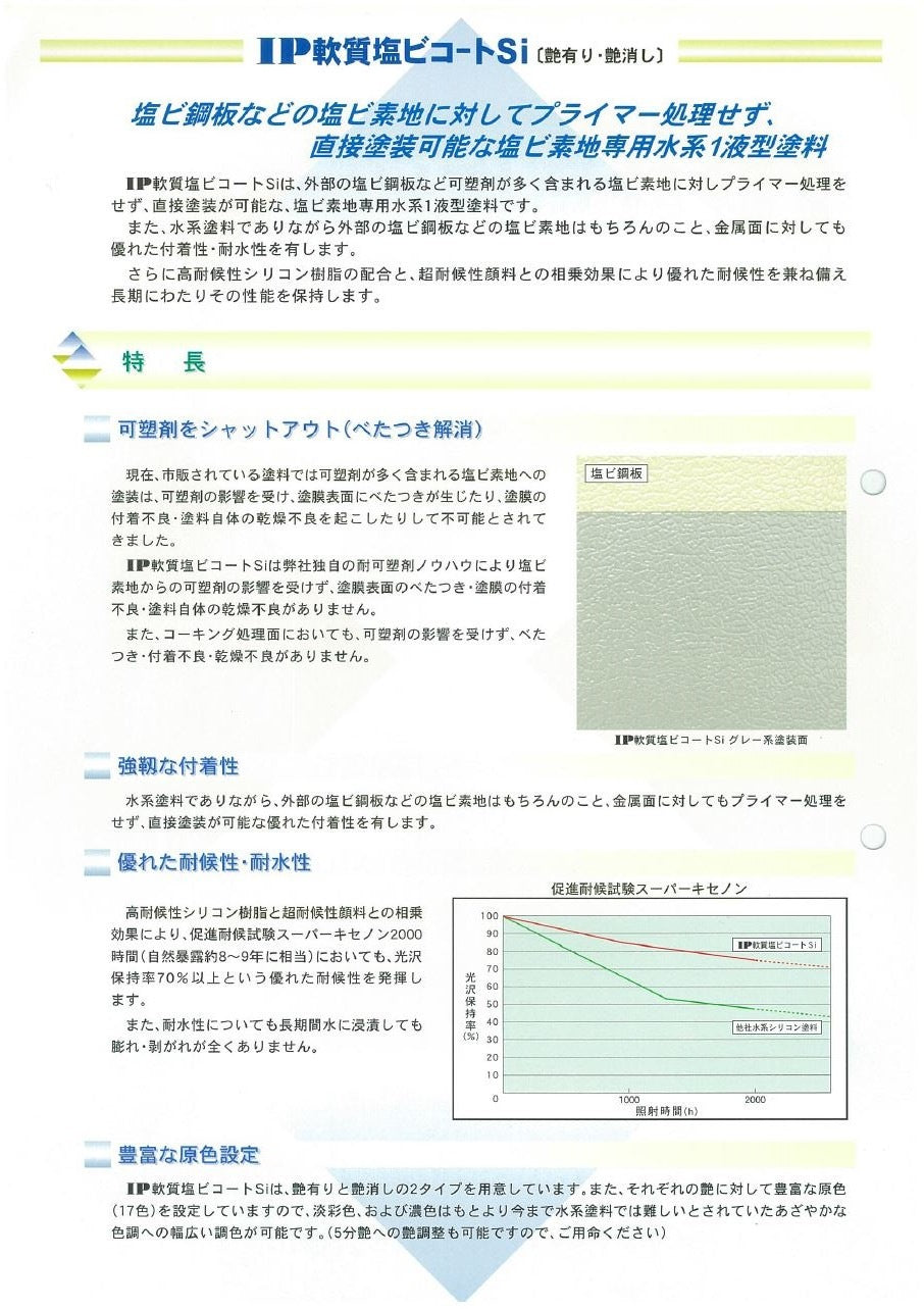 『IP軟質塩ビコートSi』は、外部の塩ビ鋼板など可塑剤が多く含まれる塩ビ素地に対しプライマー処理をせず、直接塗装が可能な、塩ビ素地専用水系1液型塗料です。