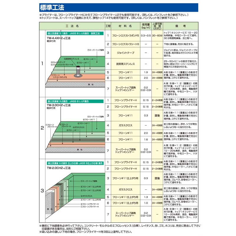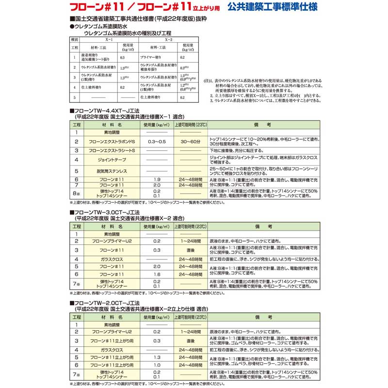ウレタン塗膜防水材の優れた特性を生かす JASS8、国土交通省共仕適合の工法など、 用途に適した仕様が可能です。