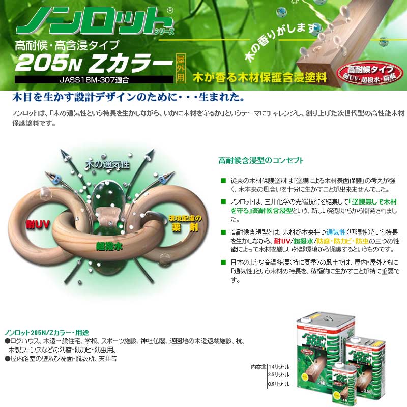 ノンロット205N/Zカラーは、最先端技術を駆使した特殊顔料がたっぷり木材にしみ込み、UVを効果的に反射・吸収して木を守ります。