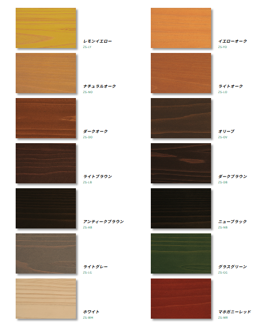 レモンイエロー、イエローオーク、ナチュラルオーク、ライトオーク、ダークオーク、オリーブ、ライトブラウン、ダークブラウン、アンティークブラウン、ニューブラック、ライトグレー、グラスグリーン、マホガニーレッド、ホワイト