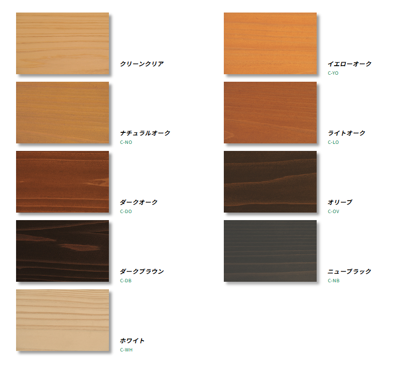 クリーンクリアー、イエローオーク、ナチュラルオーク、ライトオーク、ダークオーク、オリーブ、ダークブラウン、ニューブラック、ホワイト