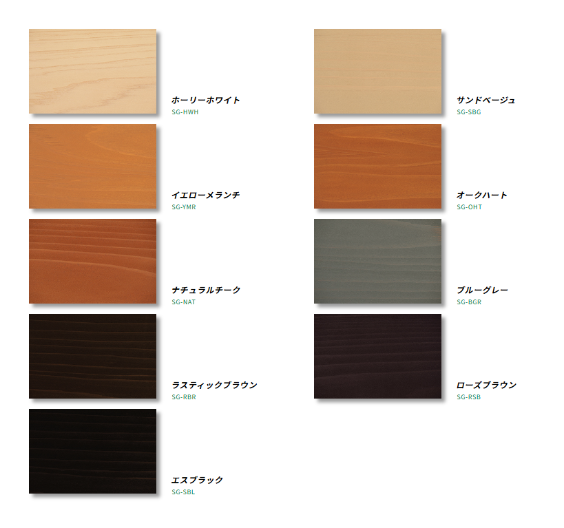 イエローメランチ、オークハート、ナチュラルチーク、ホーリーホワイト、ラスティックブラウン、ローズブラウン、エスブラック