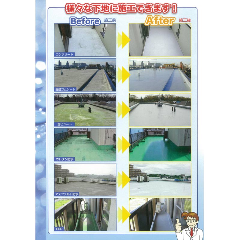 (アスファルト防水、合成ゴムシート、塩ビシート、ウレタン既存塗膜、FRP防水)に塗布できます。