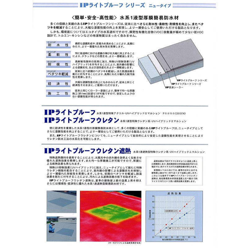 『IPライトプルーフ』は、施工性、安全性、経済性に優れた、厚膜(2回塗り:約1mm)簡易防水材です。