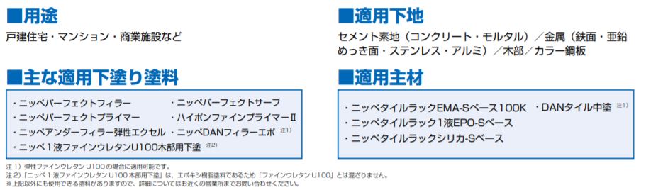 コンクリート面(現場打ち)、セメント建材系、塗り替え改修用(アクリルリシン、吹付けタイル、その他旧塗膜)、モルタル仕上げ面、ALCパネル、鉄部、カラー鋼板(トタンなど)