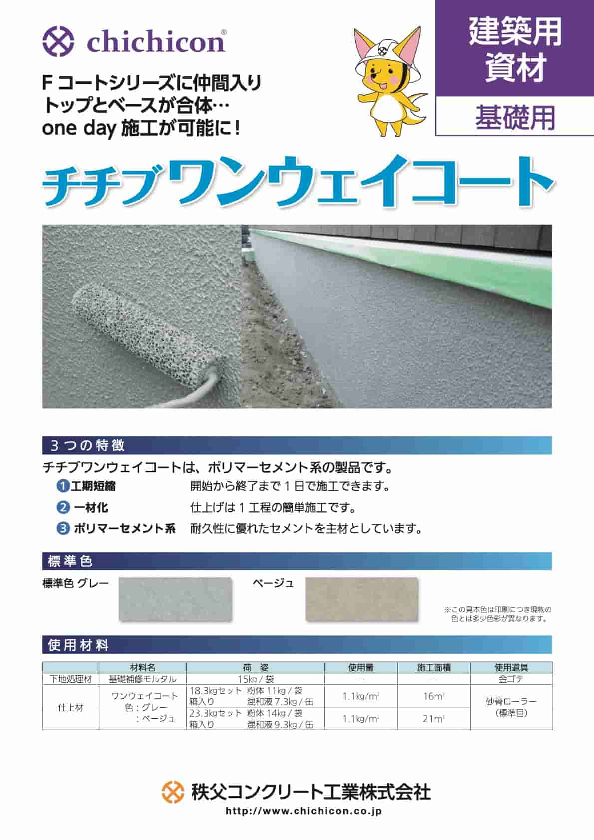 チチブワンウェイコートは、一材化した基礎仕上材です。1工程の施工ですので、 開始から終了まで1日で仕上がります。