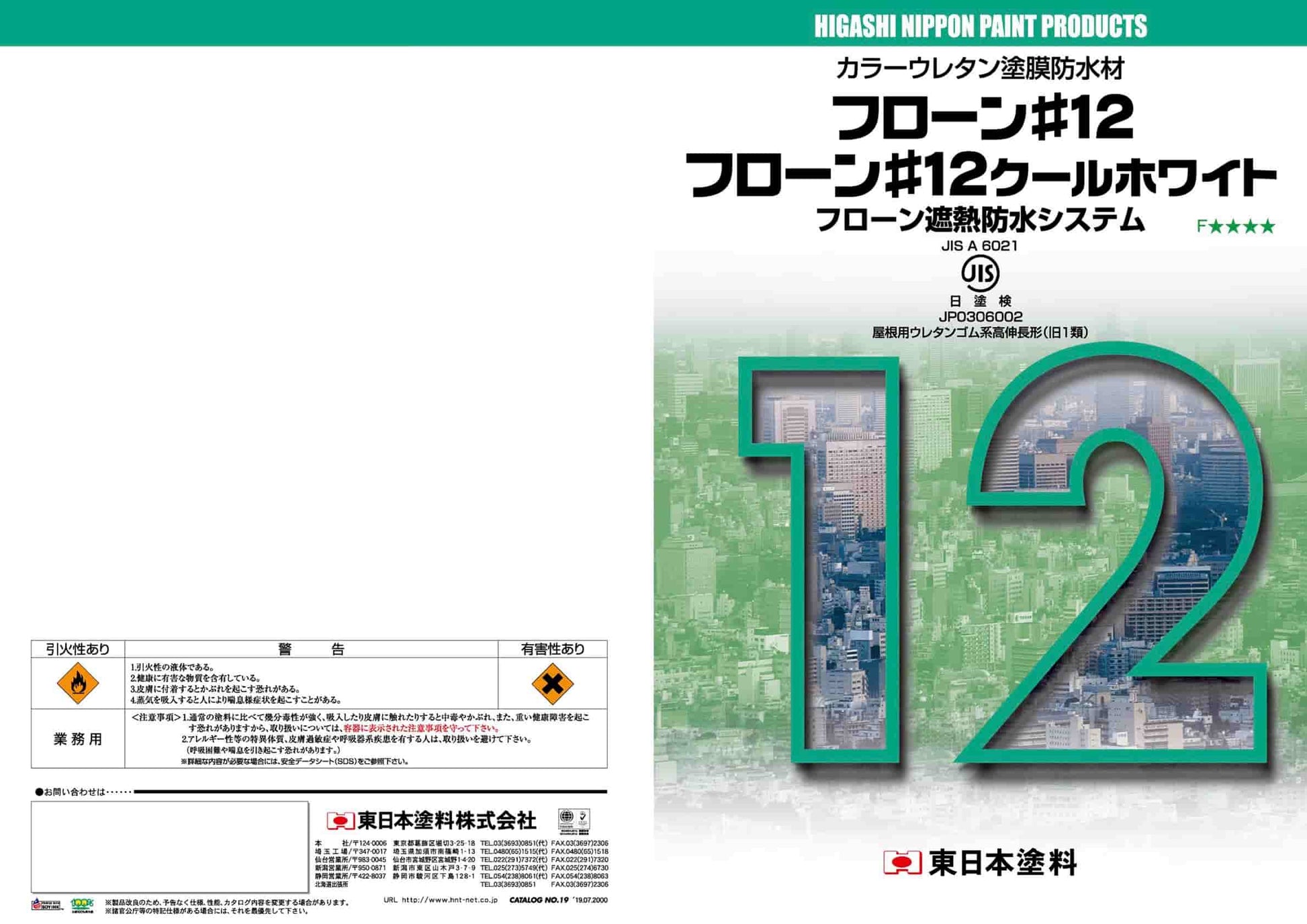 カラーウレタン塗膜防水材フローン#12は、コストを重視した材料で、優れた性能と高品質で高度な防水性能を発揮します。下地亀裂に対する追従性に優れ、弾性のある強靭な塗膜を形成し、水をシャットアウトします。また、ウレタン塗膜防水材の優れた特性を活かすJASS 8、国土交通省共仕適合の工法等、用途に適した仕様が可能です。屋上、ベランダ等の防水材として、耐候性に優れ、数多くの施工実績を持つ信頼性の高い塗材です。