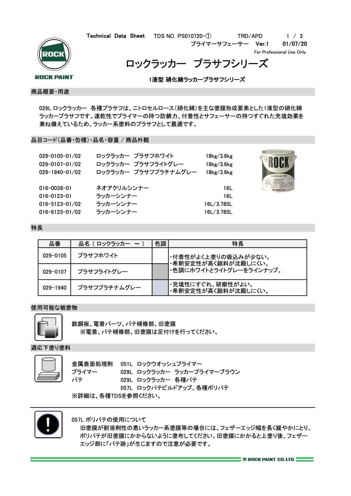 029L ロックラッカー 各種プラサフは、ニトロセルロース(硝化綿)を主な塗膜形成要素とした1液型の硝化綿